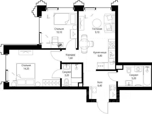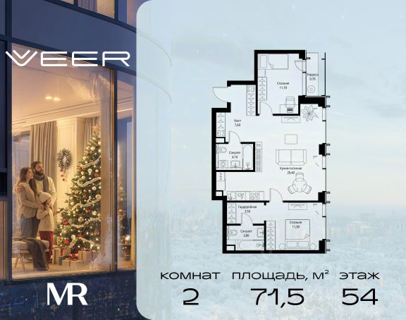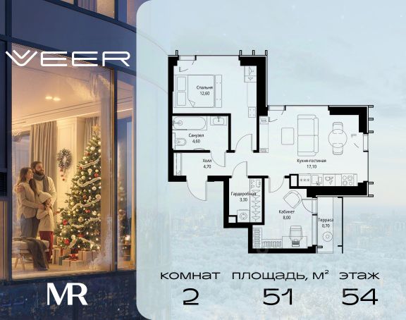 Прямая продажа от застройщика. Продаётся 2-комнатная квартира общей площадью 51 м² без отделки в ЖК VEER на 54-м этаже 59 этажного дома. Жилой комплекс бизнес-класса VEER от компании MR — это футуристичный мультиквартал, расположенный в престижной локации на западе Москвы. Благодаря переменной высоте башен — двух 22-этажных, 46-этажной и двух 59-этажных — возникает динамичность в силуэте комплекса, а его яркий образ вносит разноплановость в архитектурный пейзаж района. Расположение и транспортная доступность: • VEER удобно расположен в непосредственной близости от Кутузовского проспекта, обеспечивая быстрый доступ к центральным районам Москвы • Комплекс находится непосредственно напротив самого большого природного заказника в Москве - парка "Долина реки Сетунь", а за семь минут можно доехать до памятника садово-паркового искусства, Троекуровского леса. • Всего в 15 минутах - центр города, самая престижная бизнес-школа управления России "Сколково", дом творчества "Переделкино". • 18 минут пешком до м. "Давыдково" • Открытие новых станций метро в шаговой доступности в будущем Инфраструктура: Разнообразить свой день резиденты VEER смогут также проводя больше времени на свежем воздухе. Двор разделен на 4 зоны разных эмоций и действий, которые пересечены и соединены веерными прогулочными маршрутами: • Спортивная площадка устроена в глубине "Кленовой рощи" • В "Чайном домике" будет создан навес с утеплением для отдыха в любую погоду • Площадки для детей воплотятся в "Волшебный лес" с цветами, зеркалами и световым дизайном • "Центральная площадь" устроена у водного оазиса живописного пруда. Компания MR предлагает своим клиентам специальные условия приобретения квартир в рамках программ ипотечного кредитования от банков-партнеров.