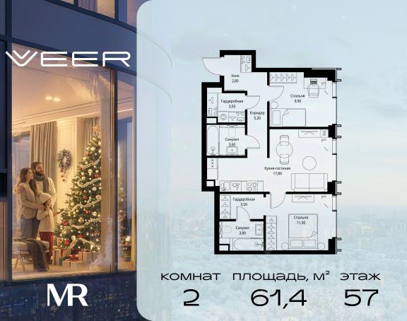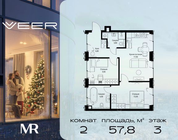 Прямая продажа от застройщика. Продаётся 2-комнатная квартира общей площадью 64.30 м² без отделки в ЖК VEER на 15-м этаже 59 этажного дома. Жилой комплекс бизнес-класса VEER от компании MR — это футуристичный мультиквартал, расположенный в престижной локации на западе Москвы. Благодаря переменной высоте башен — двух 22-этажных, 46-этажной и двух 59-этажных — возникает динамичность в силуэте комплекса, а его яркий образ вносит разноплановость в архитектурный пейзаж района. Расположение и транспортная доступность: • VEER удобно расположен в непосредственной близости от Кутузовского проспекта, обеспечивая быстрый доступ к центральным районам Москвы • Комплекс находится непосредственно напротив самого большого природного заказника в Москве - парка "Долина реки Сетунь", а за семь минут можно доехать до памятника садово-паркового искусства, Троекуровского леса. • Всего в 15 минутах - центр города, самая престижная бизнес-школа управления России "Сколково", дом творчества "Переделкино". • 18 минут пешком до м. "Давыдково" • Открытие новых станций метро в шаговой доступности в будущем Инфраструктура: Разнообразить свой день резиденты VEER смогут также проводя больше времени на свежем воздухе. Двор разделен на 4 зоны разных эмоций и действий, которые пересечены и соединены веерными прогулочными маршрутами: • Спортивная площадка устроена в глубине "Кленовой рощи" • В "Чайном домике" будет создан навес с утеплением для отдыха в любую погоду • Площадки для детей воплотятся в "Волшебный лес" с цветами, зеркалами и световым дизайном • "Центральная площадь" устроена у водного оазиса живописного пруда. Компания MR предлагает своим клиентам специальные условия приобретения квартир в рамках программ ипотечного кредитования от банков-партнеров.