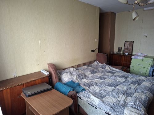 Спальня закрывается, укомплектована металлической двуспальной кроватью, натенной полкой, тумбочкой.