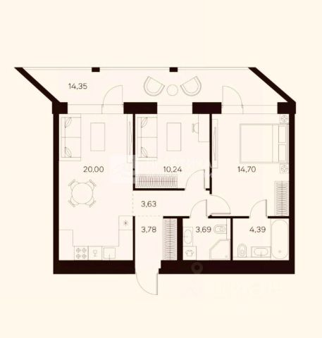 Общая площадь: 66,4м2, жилая: 24,51м2, площадь просторной кухни-столовой: 17,58м2.