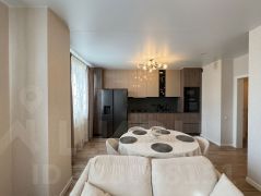 На кухне встроенная техника: варочная панель, духовой шкаф, микроволновая печь, посудомоечная машина, вытяжка. Организована полноценная обеденная зона, диван и ТВ-зона.