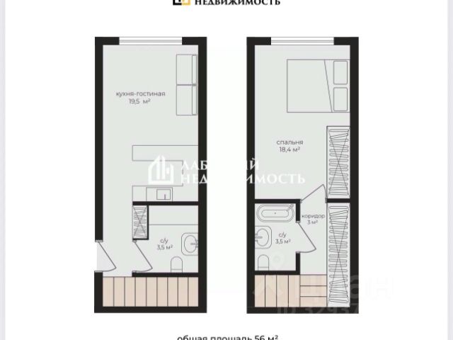 На первом этаже просторная кухня-гостиная 19. 5 м², совмещенный санузел 3.5 м², на втором этаже спальня 18, 4 м², совмещенный санузел 3.5 м².