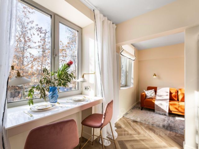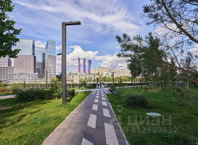 Рядом оборудованная набережная Москва-реки с зоной отдыха, лежаками, настилами и потрясающими видами на Москва-Сити.