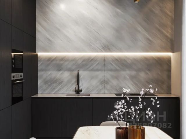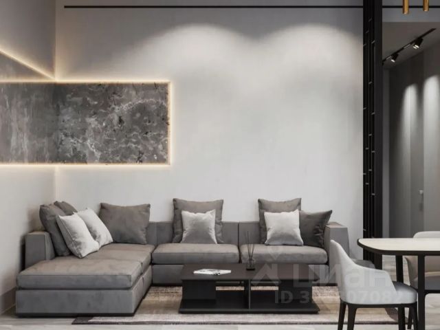 - кухня-гостиная обладает наиболее теплой атмосферой, это создается благодаря локальному, дизайнерскому освещению и оформлению, выполненного в спокойной цветовой гамме. В зоне кухни имеется вся встроенная техника, уже являющаяся стандартом в данном сегменте, а так же оснащена достаточное количество мест хранения. В зоне гостиной установлен диван для комфортного времяпрепровождения с друзьями, коллегами или же собственного. Под телевизором имеется подвесная тумба, позволяющая разместить дополнительное звуковое/игровое оборудование, а так же декор. Вместительные ящики можно использовать под любое назначение;