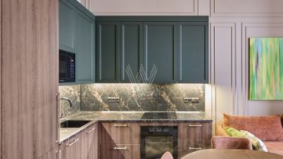 Апартаменты укомплектованы мебелью, выполненной под заказ, и встроенной бытовой техникой европейских производителей: посудомоечная машина, индукционная плита, духовой шкаф, полноразмерный холодильник, стиральная машина.