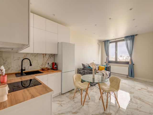 КВАРТИРА: Общая площадь 43 м, жилая площадь 28м, кухни 8 м, высота потолков 3.3 м. Окна квартиры выходят в обе стороны. В квартире сделан дизайнерский ремонт, из высококачественных материалов зарубежных брендов. Стены в ванной комнате и все подоконники из натурального мрамора, столешницы в ванной комнате и на кухне из натурального гранита, паркет - массив ценных пород дерева, остальные полы опять же, натуральный мрамор с умным программируемым подогревом подразделённым на три отдельно программируемые группы: кухня, ванная комната и коридоры с прихожей. Алюмодеревянные окна полного открывания без импостов (стоек посередине окна), тройные стеклопакеты, натуральные деревянные жалюзи. Установлена диммируемая система скрытого периметрического освещения - также подразделена на несколько групп на всех стенах.
