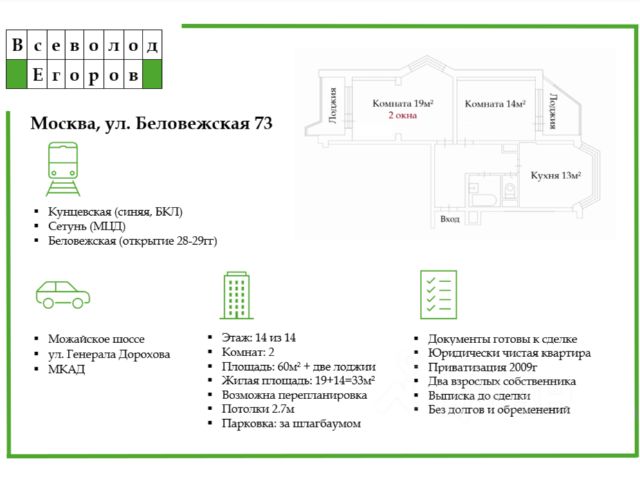 Лот: 97854. В продаже стильная квартира в жилом квартале "Сколково Парк". Планировка: гостиная-кухня с выходом на теплую лоджию, изолированная спальня с гардеробной, ванная комната. Выполнена отделка из материалов премиум-класса по авторскому дизайн проекту: краска Little Green, доска высшей категории из бука, итальянские двери из массива дуба с фурнитурой AGB, встроенные конвекторы отопления, бесшумная система кондиционирования Mitsubishi Electric. Итальянская кухня укомплектована встроенной техникой класса премиум: двухкамерный холодильник Liebherr, посудомоечная машина, варочная панель, духовой шкаф, вытяжка. Квартиры в жилом квартале премиум-класса оборудованы коммуникациями последнего поколения: мощная приточно-вытяжная вентиляция, очистка воды, автономные электростанции, система пожаротушения, скоростные бесшумные лифты KONE. Трехкамерные панорамные окна Schuco ориентированы на юго запад, открываются красивые закатные виды. Высота потолка 3 м. В комплексе предусмотрен подземный паркинг. "Сколково парк" жилой квартал на территории ландшафтного парка с каскадной набережной реки Сетунь, общая площадь 9 Га. Идеальная транспортная доступность, в 10 минутах от метро "Славянский бульвар", прямой выезд на МКАД и Кутузовский проспект. До "Москва-Сити" 20 минут на автомобиле. В пешей доступности Азбука вкуса, фермерские продукты, кафе и рестораны, аптеки, салон красоты Buro Beauty, фитнес-клубы: World Class, Pro Trener, Crocus Fitness, школы и сады, Международная гимназия Сколково, Cambridge Int.School, МШУ Сколково. Здравствуйте, я Елизавета Васильева, брокер международной консалтинговой компании NF GROUP. Подробно расскажу об этой квартире и районе, оперативно организую просмотр и согласую лучшие условия. Участник ассоциации агентств элитной недвижимости AREA