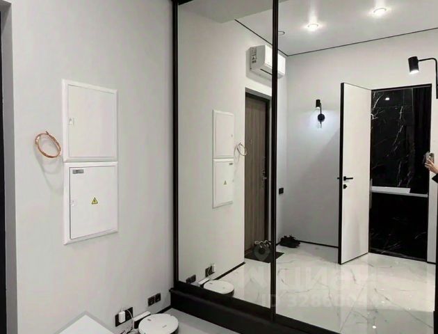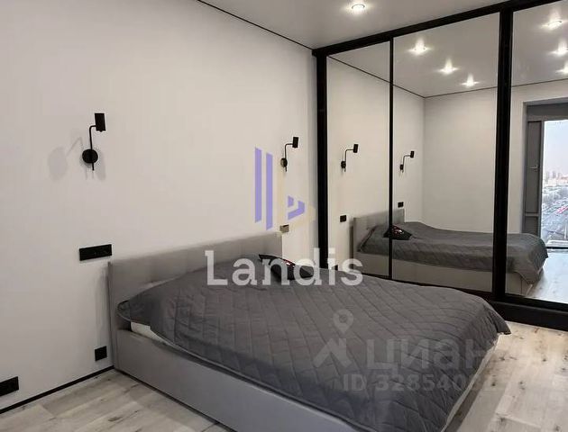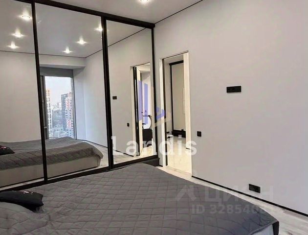 Спальня с двумя окнами в "пол". Установлен спальный гарнитур с большой кроватью шириной и длинной 2м.*2м. производства "Аскона". Матрац ортопедический, средней жесткости. Также две прикроватные тумбы, выпаленные в одинаковой с кроватью обивке, в цвете молочный белый. Обивка - также покрытие Ever clean, которое создает водоотталкивающий эффект. На тумбах светильники, в абажуре из этой же ткани, производства "Аскона". Шкаф огромный и очень вместительный, ширина- 3 метра, высота 3 метра. Имеется отделения для ремней и ювелирных изделий, а также 4 больших выдвижных ящика