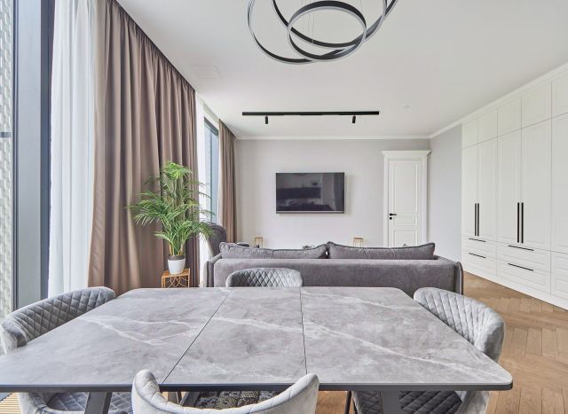 -Кухня выполнена на заказ, качественная фурнитура, доводчики и открывание push, столешница из натурального камня. Вся встроенная техника премиальных брендов: посудомоечная машина Bosch, вытяжка Elica, духовой и винный шкаф Мiele, холодильник Liebherr, варочная поверхность Siemens.