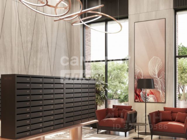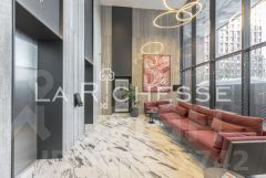 Просторные двухуровневые входные группы с высокими потолками, колясочные и зоны ожидания у каждого из входов. Дизайнеры бюро HAAST создали интерьер лаунж-зоны, вдохновившись природой. Специально подобранные материалы с натуральной текстурой камня и латуни, зелень керамогранита на стенах, роскошная меблировка и картины с флористическими мотивами или наоборот абстракции с буйством сочных красок тонко сочетаются между собой, которые освещаются причудливыми медными светильниками, наполняя пространство домашним уютом.