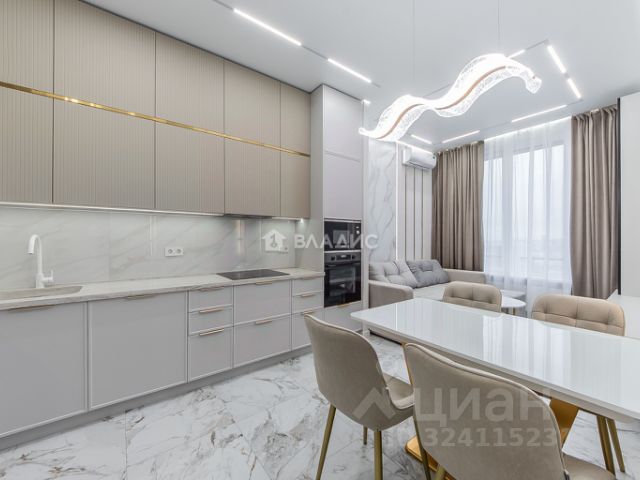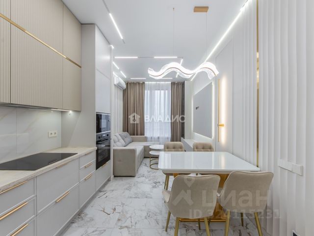 Кухня полностью укомплектована — вытяжка, индукционная плита, микроволновка, духовка, встроенный в кухню холодильник (не выбивается из интерьера вообще). Также встроена большая посудомойка! Хватит помыть всю посуду после компании за один раз. В зоне гостиной угловой диван и телевизор на кронштейне, можно поворачивать в любую сторону (удобно во время готовки и при просмотре тв на диване). Небольшой круглый стол, удобно можно передвигать в центр комнаты, если пришли гости.