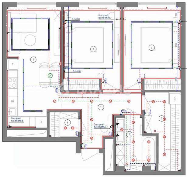 Санузел совмещенный, есть много освещения (два светильника на потолке и подсветка зеркала), также встроена вентиляция. Все, что касается канализации, удобно спрятано за открывающейся плиткой, легко перекрыть воду при необходимости. Также установлена система Нептун, которая перекрывает воду при контакте датчиков с водой на случай протечки. На стене висит сушилка-обогреватель, на которую можно спокойно вешать все, что захотите.