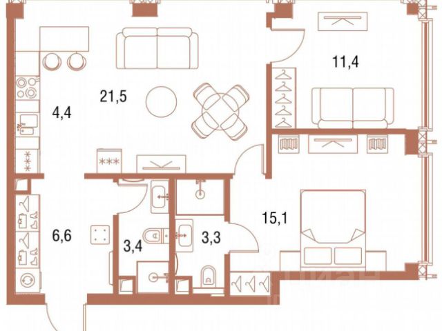 Площадь спален: 13,7 м² и 12,5 м²;