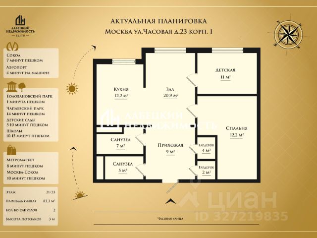 Предлается светлая, просторная, современная евро 3-х комнатная квартира в одном из самых комфортных для проживания в Москве районе Аэропорт. ЖК "Весна на Балтийской"расположен в непосредственной близости от метро Сокол. Квартира обладает прекрасными видовыми характеристиками, из окон хорошо видны купола Храма Всех Святых на Соколе. Планировка продуманна и максимально функциональна. Квартира не требует ремонта и вложений и готова к немедленному заселению. ПРО КВАРТИРУ: - Дизайнерский ремонт с проектом - Большие окна, обеспечивают уют, постоянный источник естественного света и тишину на протяжении всего дня. - Наличие экологического парка, добавляет комфорта и возможности для отдыха на свежем воздухе, а также идеально подходит для прогулки с детьми и любимыми домашними питомцами! - Современная архитектура и закрытое внутридомовое пространство, индивидуальный проект ЖК. - Современный, чистый подземный паркинг. - Новая дорогая сантехника. - Техника Miele, PHILIPS, JVC. ОБЩАЯ ИНФОРМАЦИЯ: - Площадь: 83.3 кв. м - Жилая площадь: 44.1 кв. м - Площадь кухни: 12.2 кв. м - Этаж: 21/23 - Год постройки: 2008 - Высота потолков: ~ 3 м РАСПОЛОЖЕНИЕ И ТРАНСПОРТ: Метро Сокол - 8 минут ходьбы. МЦД Красный Балтиец - 7 минут ходьбы. Амбулаторный пруд - 5 минут ходьбы. Головановский парк - 1 минута ходьбы. Тимирязевский парк - 20 минут. Удобный выезд на: Ленинградский проспект - 3 минуты езды. Ленинградское шоссе - 5 минут езды. На Ленинградском проспекте и улице Усиевича ходят много автобусов. До Центра Москвы - 10 минут езды. ПРО ИНФРАСТРУКТУРУ: Всегда есть свободные места для парковки. Территория дома огорожена. Есть подземная парковка. Подъезд чистый. Соседи приличные :) Рядом есть все необходимые объекты инфраструктуры. Много школ и дет.садов в ближайших дворах, в том числе 3 школы и 4 садика совсем рядом. В 5 минутах ходьбы детская и взрослая поликлиника, много пвз, ресторанов, частных клиник, кофеен и ВУЗов в шаговой доступности. ТЦ МетроМаркет со всеми необходимыми магазинами. Ленинградский Рынок - 7 минут ходьбы. Финансовый университет - 20 минут ходьбы. Синергия - 3 минуты ходьбы. РОАТ - 3 минуты ходьбы. Это современный дом высокого качества, в одном из самых перспективных районов Москвы, для тех, кто ценит комфорт, уединенность, спокойствие и индивидуальность! Торг уместен, но после просмотра :) Звоните, приезжайте на просмотры, с радостью Вам всё покажем и ПРОКОНСУЛЬТИРУЕМ ПО СДЕЛКЕ. ДОБАВЛЯЙТЕ объявление В ИЗБРАННОЕ, чтобы не потерять.