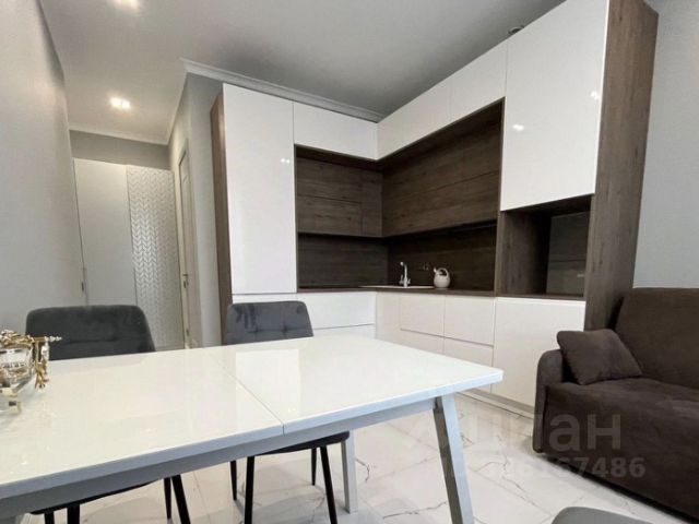 Кухня объединена с просторной гостиной, что создает комфортное единое пространство, идеально подходящее как для приема гостей, так и для уютной зоны отдыха с шикарным видом.