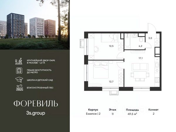Предчистовая отделка в подарок! Пешая доступность от метро и московская прописка! Продается уютная 2-комн. квартира площадью 49,5 кв.м на 9 этаже 17 этажного жилого комплекса бизнес-класса Foreville от 3S Group. Общая площадь: 49,5 кв.м., жилая: 35,7 кв.м., площадь кухни-гостиной: 17,1 кв.м., высота потолков: 2,72 м., окна выходят во двор. Квартира предлагается без отделки, что идеально подходит для воплощения собственного дизайнерского решения. Также доступна опция предчистовой отделки, стоимость которой включается в общую цену квартиры. О проекте: Пространство Комплекс располагает крупнейшим приватным двор-парком в Новой Москве площадью 1,2 Га, предлагая жителям огромное пространство для отдыха, спорта и игр на свежем воздухе. Природный ландшафт Внутренний лесопарк с более чем 183 взрослыми деревьями и 10 320 цветущими кустарниками создает уникальную природную атмосферу для каждого времени года. Игровые и спортивные зоны Обширные площадки с безопасным покрытием, специализированные зоны для детей разных возрастных групп и взрослых, включая воркаут и настольный теннис, способствуют активному и здоровому образу жизни. Экологичность и долговечность Использование натуральных материалов, таких как лиственница, и крупноформатной бетонной плитки для покрытия, подчеркивает стремление проекта к экологичности и устойчивости. Безопасность и уединение Внутренний двор без машин обеспечивает безопасность для детей и спокойствие для взрослых. Территория огорожена и находится под круглосуточным видеонаблюдением. Сохранение времени Благодаря превосходной транспортной доступности и близости к новой станции метро Корниловская, Foreville позволяет жителям экономить время для семьи и отдыха на природе, минимизируя необходимость длительных поездок. Foreville не просто жилье, а целая экосистема для комфортной и гармоничной жизни на свежем воздухе, совмещая преимущества городской инфраструктуры и непосредственную близость к природе.