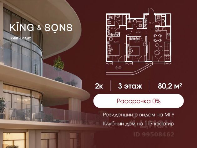 КИНГ энд САНС это клубный дом на 117 резиденций премиум-класса, расположенный на престижной и исторической улице Мосфильмовская. Из большинства квартир открываются панорамные виды на МГУ, "Москву-Сити", особняки посольств и парки. Это место для тех, кто не хочет выбирать между комфортом мегаполиса и уединением на природе. Проект разработан международным архитектурным бюро, которое входит в ТОП-2 в мире. Фасады из натурального камня, мягкие формы здания, максимально открытое остекление, окна в пол — все это делает облик здания выразительным и уникальным. В проекте предусмотрено 70% квартир с террасами. Потолки от 3,2 до 4,7 м. Паркинг на 110 машиномест. Для будущих резидентов продуманы разнообразные общественные пространства зимний сад в лобби первого этажа, секретный сад с зоной открытого огня, лаундж-зона с кинотеатром на крыше, собственный спортзал, зоны для занятий йогой и медитацией. КИНГ энд САНС это фамильная недвижимость, которую с гордостью передают по наследству