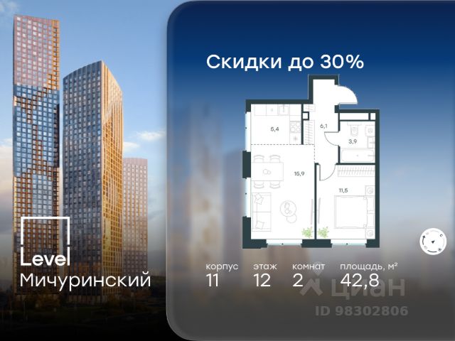 Цена указана с учётом скидки при 100%-й оплате, несубсидированной ипотеке, рассрочке (кроме программы "Рассрочка 0%"). В жилом квартале, расположенном на границе с природным заказником "Долина реки Очаковки", продаётся 2-комнатная квартира площадью 42.30 кв.м с отделкой white box. Квартира расположена на 10 этаже 42-этажного корпуса 10 в жилом комплексе бизнес-класса Level Мичуринский (компания Level Group/Левел групп). Отличная транспортная доступность: - от 10 мин. пешком до станции метро "Мичуринский проспект" - 15 мин. пешком до станции метро "Аминьевская" - 7 мин. на авто до МКАД - 10 мин. на авто до ТТК - 15 мин. на авто до Москва-Сити Продуманный архитектурный проект: - Выразительная архитектура от известных бюро: корпуса 1-6 - СПИЧ, корпуса 7-13 - Borisov Architects; - Из окон открываются живописные виды на парки, Москва-Сити и МГУ; - Высокие потолки до 6,35 м; - Стильные лобби с окнами в пол и высокими потолками до 4,7 м; - С каждого этажа дома на лифте можно спуститься в подземный отапливаемый паркинг. Расположение: Level Мичуринский строится в одном из самых зелёных районов Москвы - Очаково-Матвеевское. Этот уголок столицы идеален для поддержания здорового образа жизни. В шаговой доступности от проекта находятся заказник "Долина реки Очаковки" - 1 мин. пешком и Очаковский парк - 7 мин. пешком. На велосипеде можно добраться до таких парков, как "Событие", парк Олимпийской деревни, парк 50-летия Октября и парк Школьников. В 15 минутах езды на авто расположено более 30 детских садов (из них 14 в пешей доступности), 32 школы (из них 13 в пешей доступности) и 14 вузов. Также в ближайшем окружении - более 25 медицинских учреждений, 11 спортивных клубов и 22 продуктовых супермаркета. Внутренняя инфраструктура: На территории жилого комплекса строится три детских сада и школа. На первых этажах домов откроется супермаркет, фитнес-центр, ресторан, кафе и другие сервисы. Подземные этажи займут паркинги: трёхуровневые - в этапах 1 и 2, одноуровневый - в этапах 3 и 4. Преимущества проекта: - 4,5 га благоустроенной территории с видовым мостом, уличным кинотеатром, зонами для тихого отдыха, работы, воркаута, площадки для петанка, футбола, настольного тенниса и пляжного волейбола. - Дизайнерские лобби с панорамным видом на двор, мойками для лап животных и комфортными зонами ожидания. - Безопасность жителей: круглосуточное видеонаблюдение всех зон общего пользования (лобби, лифты, паркинги, детские площадки), система контроля доступа, управление видеодомофоном через мобильное приложение, единый ключ доступа на территорию жилого комплекса. - Технологии и комфорт: высокоскоростной Wi-Fi в лобби и на придомовой территории, автоматическая система контроля и учёта ресурсов, абонентская связь с консьержем, распознавание номеров автомобилей при въезде в паркинг и выезде из него.