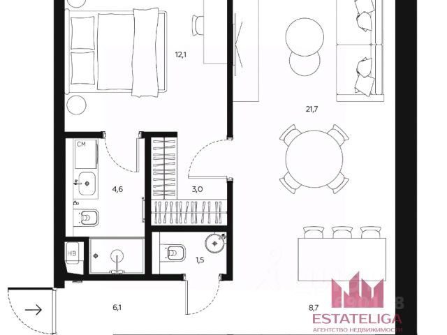 Одна большая спальня 16.5 кв.м и кухня-гостиная 31 кв. м, ванная 5.5 кв.м.