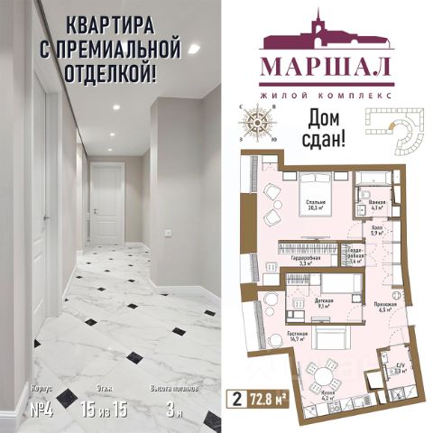 Продаётся 2-комнатная квартира в сданном доме (Маршала Рыбалко, 2К4), срок сдачи: IV-кв. 2011, общей площадью 47.23 кв.м., на 5 этаже. Готовая квартира в элитном МФК "Маршал" с премиальной отделкой "под ключ" (экологичное напольное покрытие - инженерная доска Greenline и керамогранит, высококачественные системы кондиционирования и сантехническое оборудование), выполненной европейскими специалистами по эксклюзивным дизайн-проектам, подчеркнет высокий статус владельца. В квартире выполнен новый ремонт и НИКТО НЕ ЖИЛ с момента ввода в эксплуатацию. Квартиры 4-го корп. продаются с полной отделкой, что обеспечивает комфорт проживания в доме сразу после получения ключей, т.к. исключает длительный период ремонта квартир - у вас и соседей, а также сохранит презентабельные входные группы в идеальном состоянии. Из панорамных окон премиального бренда Schuco открываются завораживающие виды на столицу или уютный двор-патио с красивым ландшафтным дизайном и фонтаном, играющим огнями разноцветной подсветки в вечернее время. Роскошные интерьеры лобби: натуральный испанский мрамор, оникс, итальянская люстра ручной работы, кованая мебель. Лифты премиум-класса ThyssenKrupp. Консьерж-служба. Видеонаблюдение. Элегантные межквартирные холлы. Двери квартир со вставками из массива дуба выполнены в едином стиле. На этажах мусорокамеры закрытого типа. Элитные домофоны CAME BPT с абонентским IP-устройством hands-free с сенсорным 7 дисплеем, Wi-Fi модулем, функцией записи вызовов и автоответчика, интеграцией с IP-камерами видеонаблюдения и мобильным приложением, которое переадресует вызов с домофона на ваш смартфон - вы сможете принять его, находясь вне дома, и открыть дверь в подъезд. Из квартиры можно в любой момент связаться с консьержем по видеодомофону. МФК "Маршал" - самодостаточный город в городе на большой - 6,3 га - охраняемой территории. Большую часть занимают зеленые зоны, скверы с аллеями и фонтаном, детские городки, спортивные площадки для подвижных игр, воркаута и теннисный корт с мягким покрытием. У комплекса уникальная транспортная доступность: рядом ТПУ Панфиловская, Северо-Западная хорда, соединяющая несколько районов столицы, в 5 мин. ходьбы - ст. м. Октябрьское Поле. В нескольких мин. езды - Ленинградский пр-т, по которому можно быстро доехать до ТТК или центра Москвы, и Ленинградское ш., ведущее к аэропорту Шереметьево. Богатая собственная инфраструктура МФК "Маршал": детсады (в т. ч. английский), творческие и спортивные студии, студия раннего плавания, здание фитнес-центра с бассейном, минимаркет AB Daily, подземный паркинг на 1200 м/м, химчистка, салоны красоты, кафе, рестораны, медцентр, БЦ класса B+, где можно арендовать/купить офис и работать рядом с домом, и т.д. Комплекс получил награду TREFI Лучший проект бизнес-класса в Москве. Рядом - старинный храм, в 10 мин. ходьбы - Большая Всехсвятская Роща. Отличная внешняя инфраструктура респектабельного района Щукино: детсады, элитные общеобразовательные, музыкальные и спортивные школы, ТЦ Продам 2-комнатную квартиру 2-комнатных квартир в Маршал в Москве.