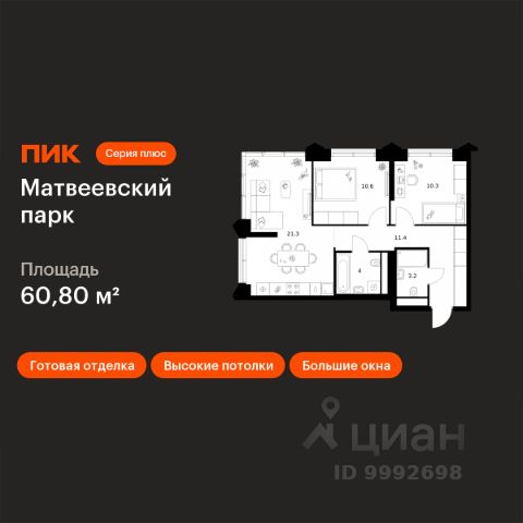 Продаётся 2-комн. квартира площадью 62,9 кв.м на 2 этаже 17 этажного дома (Корпус 1.4, Секция 4) проекта ПИК Матвеевский парк. Светлый просторный подъезд на уровне земли, функциональная планировка, большие окна, c отделкой. "Матвеевский парк" — проект "Серии плюс", расположенный на западе Москвы, в районе Очаково-Матвеевское. Ближайшая станция метро "Аминьевская" находится всего в 3 минутах пешком, а в 20 минутах — МЦД-4 "Очаково". Проект входит в состав Матвеевского кластера — современного района, где есть всё необходимое для комфортной жизни: социальная инфраструктура, парки и общественные пространства. Проект расположен в Матвеевском кластере — новом современном районе, который будет состоять из четырёх кварталов: "Матвеевский парк", "Новое Очаково", "Большая Очаковская 2" и Вангарден. Перемещаться между кварталами будет удобно по 350-метровому пешеходному мосту, под которым появится уютный зелёный парк. У проектов будет общая инфраструктура и благоустроенная территория. Уже открыта часть пешеходного бульвара, который строится по проекту британского бюро. Здесь можно гулять после работы, играть с детьми, заниматься спортом и отдыхать у сухого фонтана с ночной подсветкой. В будущем в кластере появится пешеходный мост, который соединит жилые кварталы, и комьюнити-центр "ОМА" с магазинами, кафе, местами для спорта, встреч и общения. Отдыхать и заряжаться адреналином жители кластера смогут в СпротХаб Экстрим — зоне площадью более 3 500 м², рассчитанной на любителей экстремальных видов спорта. Здесь будут площадки для безопасного катания на скейтбордах, роликах, самокатах и велосипедах. Для командных игр — например, мини-футбола и стритбола — появится отдельная универсальная площадка с покрытием из резины. Помимо этого, на территории "Матвеевского кластера" начнут работу пять новых школ, шесть детских садов, поликлиника и многофункциональный спортивный комплекс. Архитектурную концепцию корпусов 4 квартала разработало российское бюро "КАТАРСИС". Акцентные белые корпуса с большими окнами делают архитектуру проекта мощной и запоминающейся. А фоновые части зданий придают образу размеренность и спокойствие. В лобби "Матвеевского парка" будет удобная зона ожидания, где можно встретить друзей, курьера или дождаться такси, а также гостевая туалетная комната и колясочная. Артикул 747223 (Застройщик ООО "СПЕЦИАЛИЗИРОВАННЫЙ ЗАСТРОЙЩИК "ЦЕНТРПОЛИС")