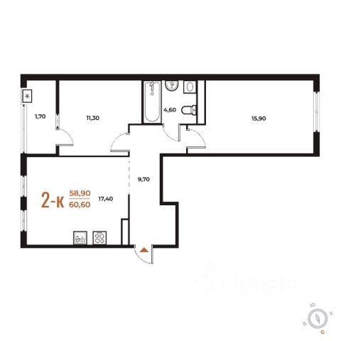 Продаётся 2-комнатная квартира в строящемся доме (Корпус 1), срок сдачи: I-кв. 2026, общей площадью 58.9 кв.м., на 2 этаже. Комплекс отдельно стоящих жилых корпусов с нежилыми помещениями и подземной автостоянкой.