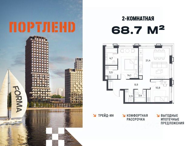 Цены указаны с условием 100% оплаты и стандартной ипотеки. Продаётся 2-к. квартира, 10 этаж в жилом комплексе бизнес-класса ПОРТЛЕНД от девелопера FORMA. ЖК расположен на берегу Москвы-реки в северной части района Печатники в акватории Южного речного порта. Основные преимущества проекта: • Самая протяженная береговая линия реки в Москве 13 км. • Вид на реку в сторону запада панорамные окна на самое широкое водное пространство Москва-реки (900 м) и на закат. • 95% квартир с видом на воду. • К ПОРТЛЕНД не примыкает крупных автомагистралей - отсутствие фонового шума дорог. • В перспективе ближайших 11 лет на территории района запланировано грандиозное преобразование и комплексное развитие. • Собственная набережная длиной 412 м., которая после завершения строительства сомкнется с эко-парком Печатники. • Прямой выход к воде и отсутствие проезжей части между ПОРТЛЕНД и береговой линией. • Инфраструктурное разнообразие: супермаркеты, крупные торговые центры, рестораны, кафе, фитнес-клубы, бьюти-салоны, компании сферы услуг и многое другое. • Собственная школа на 300 мест и детский сад на 275 мест. • Паркинг на 650 м/м • Транспортная вседоступность: метро, авто, велосипед, речной трамвай, канатная дорога • 15 мин. пешком до м. Печатники, 15 мин. на авто до ТТК, 20 минут на авто до Садового кольца