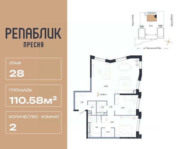 Рассрочка 0% с первым взносом от 20%, ипотека с субсидией или наличные. Подберём способ оплаты индивидуально. Продается 3комнатная квартира на 23 этаже от застройщика Страна Девелопмент. Площадь квартиры 110.64 кв. м. Дизайн-квартал "Republic" — новый проект премиум-класса в Москве от федерального застройщика "Страна Девелопмент". ЦАО, Пресня, 7 мин. от метро "Белорусская". 10 жилых башен и 4 восстановленных здания локомотивного депо образуют уникальное пространство. "Republic" — место, где вы ощутите гармонию истории и современности. За 12 мин. вы сможете дойти до Московского зоопарка, за 10 мин. на авто доехать до Патриарших прудов и Белого дома. Преимущества • Благоустройство. SPA-комплекс с бассейном и термами, гастрономический, учебный и шопинг-центры, приватный бульвар и яркие арт-пространства — для жителей предусмотрены все элементы премиального комфорта. • Панорама на центр. Наслаждайтесь видами ЦАО каждый день: панорама на историческую Пресню и башни Москва-Сити — из своей квартиры или с приватной террасы на крыше. • Концептуальное лобби в каждой башне. С общей террасой на кровле, с библиотекой, коворкингом и фитнес-рум. Стойка консьержа перетекающая в бар и др. • Современные форматы квартир. Свободные планировки, с террасой или балконом, с возможностью установки камина, от 1-комнатных до пентхаусов. • Отделка Квартиры сдаются без отделки или в формате White box. При White box уже выполнены все шумные и грязные работы: произведена разводка электричества с подрозетниками, установлены откосы из гипсокартона, устроена стяжка пола с шумоизоляцией и др. Способы покупки Сотрудники "Страна Девелопмент" будут сопровождать вас на каждом этапе сделки, помогут получить одобрение по ипотеке или снизить ежемесячный платеж. - ипотека (стандартная/с субсидией/траншевая) - рассрочка (с ПВ от 20%) - с использованием материнского капитала - оплата наличными