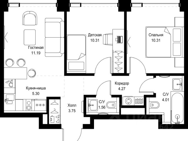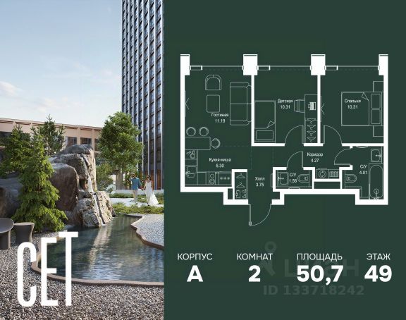 Прямая продажа от застройщика. В ЖК Сет продается 2-комнатная квартира площадью 53.39 м², расположенная в корпусе А, на 28 этаже 52 этажного дома. Сет имеет стратегически выгодное расположение в ЗАО, в районе с большой историей и блестящим будущим: между природной зоной долины реки Сетунь и Кутузовским проспектом. В рамках возведения первой очереди предусмотрено три корпуса высотой 18, 45 и 59 этажей. На верхних этажах спроектированы общедоступные смотровые площадки с панорамным обзором на центр столицы. Преимущества проекта: • Функциональные планировочные решения • Контроль проникновения через входную дверь • Система управления освещением и температурой в квартире • Система защиты от протечек с функцией перекрытия воды • Вход в подъезд по биометрическим считывателям Face ID • Скоростные лифты • Двухуровневый подземный охраняемый паркинг на 495 машино-мест Застройка Сет включает в себя не только жилые корпуса, но и инфраструктурные объекты. Все необходимое для повседневного комфорта будет расположено в шаговой доступности: • Фитнес-Клуб с бассейном • Ведущая городская школа, детский сад и школа искусств • Центр культуры и досуга • Медицинский центр • Кафе и рестораны Расположение комплекса: Пешком: • Метро "Давыдково" - 17 минут • Парк "Долина реки Сетунь" - 3 минуты • Открытие новых станций метро в шаговой доступности в будущем Инфраструктура: Разнообразить свой день резиденты Веер смогут также проводя больше времени на свежем воздухе. Двор разделен на 4 зоны разных эмоций и действий, которые пересечены и соединены веерными прогулочными маршрутами: • Спортивная площадка устроена в глубине "Кленовой рощи" • В "Чайном домике" будет создан навес с утеплением для отдыха в любую погоду • Площадки для детей воплотятся в "Волшебный лес" с цветами, зеркалами и световым дизайном • "Центральная площадь" устроена у водного оазиса живописного пруда. На машине: • "Москва-Сити" - 15 минут • Садовое кольцо - 20 минут • ТЦ "Океания" - 8 минут • ТЦ "Времена года" - 13 минут • Сколково - 12 минут • Гребной канал - 17 минут Компания MR предлагает своим клиентам специальные условия приобретения квартир в рамках программ ипотечного кредитования от банков-партнеров.