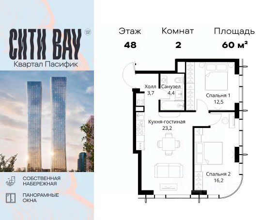Прямая продажа от застройщика. Продаётся 2-комнатная квартира общей площадью 69.28 м² с предчистовой отделкой в ЖК Сити Бэй, квартале Норс, на 4-м этаже 21 этажного дома. Концепция жилого комплекса Сити Бэй - настоящий город в городе с отлично развитой инфраструктурой и собственной благоустроенной набережной. На территории жилого комплекса расположено пять кварталов - Атлантик, Пасифик, Индиан, Норс, Клиф. Жилой квартал Сити Бэй отличается оригинальной концепцией и выделяется среди других проектов такими характеристиками как: - Архитектура, - Виды из окон, - Природное окружение, вызывая гордость у жителей и восхищение у прохожих. Вся жизнь района Покровское-Стрешнево строится вокруг водных объектов: - Пойма реки Сходни с уникальной экосистемой, - Речка Химка и Химкинское водохранилище, - Москва-река, - Канал имени Москвы. Кругом вода, и местные с удовольствием этим пользуются. А сразу за рекой - центр водного спорта в Строгино с вейк-парком и яхт-Клубами. Помимо воды, здесь очень много зелени: - Рядом Сходненский ковш памятник природы, естественный амфитеатр глубиной 40 метров; - Парк при усадьбе Братцево с фруктовым садом; - Дубовая роща "Маяк", - Алешкинский лес; - Лесопарк Покровское-Стрешнево с пляжами и бобрами. Главные транспортные артерии района: - Волоколамское шоссе, - Таганско-Краснопресненская линия метро и МЦД-2. Всего за 20 минут можно добраться до центра на машине или метро, а МЦД связывает ЖК Сити Бэй с северными, восточными и юго-восточными районами. Компания MR предлагает своим клиентам специальные условия приобретения квартир в рамках программ ипотечного кредитования от банков-партнеров.