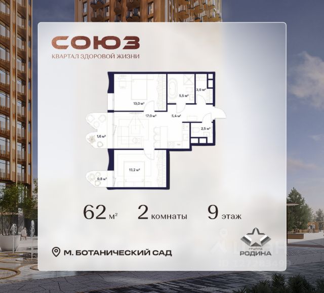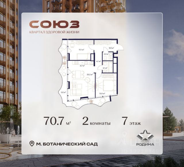 Рассрочка 0% Продаётся 2-комнатная квартира площадью 69.7 м² на 7 этаже в Жилом Комплексе "Союз". Квартал здоровой жизни премиум-класса с рекордным количеством олимпийских видов спорта: - Ледовая арена для хоккея и фигурного катания, - Футбольные поля для тренировок, - Спортивный зал для фехтования, - Бассейн на 6 дорожек, - Центр единоборств, - 4 крытых площадки для настольного тенниса, - 7 теннисных кортов (крытых и открытых), - 4 крытых площадки для сквоша, - Легкоатлетический стадион, - Площадки для баскетбола и волейбола. Уникальные форматы квартир с мастер-спальнями, приватными террасами, балконами, а также пентхаусы с открыточными видами на город. Все квартиры продаются с отделкой Shell&Core и панорамным остеклением. Расположение Пешком: - 2 мин. до парка "Сад Будущего"; - 6 мин. до ст. м. "Ботанический сад"; - 6 мин. до ст. МЦК "Ботанический сад"; - 6 мин. до парка "Леоновская роща"; На автомобиле: - 2 мин. до СВХ (МСД); - 5 мин. до Проспекта Мира; - 10 мин. до ТТК; - 15 мин. до Садового кольца; - 25 мин. до аэропорта "Шереметьево". Благоустройство - собственная спортивная инфраструктура 7 Га; - зона для пикников; - игровые и спортивные площадки для детей всех возрастов; - розарий, а также сосновые, каштановые и дубовые аллеи; - площадки под открытым небом для занятий спортом и йоги; - игровые комнаты для детей; - лаунж-зона для резидентов; - просторная переговорная для деловых встреч; - премиальный ресторан "Шабада" Сосо Павлиашвили с водными арт-объектами на прогулочной аллее, садом ароматных трав и сценой под открытым небом; - кафе, химчистки, аптеки и супермаркеты рядом с домом. Окружение - 8 парков: Сад Будущего, Леоновская роща, Хуамин, Главный ботанический сад РАН, Шереметьевская дубрава, Останкино, парк спорта "Яуза", пойма реки Яуза и музей-усадьба "Останкино"; - 3 ВУЗа: ВГИК, РГСУ, МГПУ; - 12 школ, в том числе: школа 1499 им. И.А. Докукина (топ 100), Brookes Moscow, IThub школа; - 18 детских садов, в том числе билингвальный ALERTUM KIDS; - один из крупнейших океанариумов Европы "Москвариум"; - один из крупнейших в Европе торгово-развлекательных центров "Европолис".