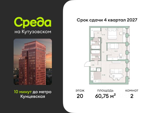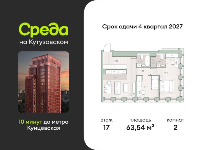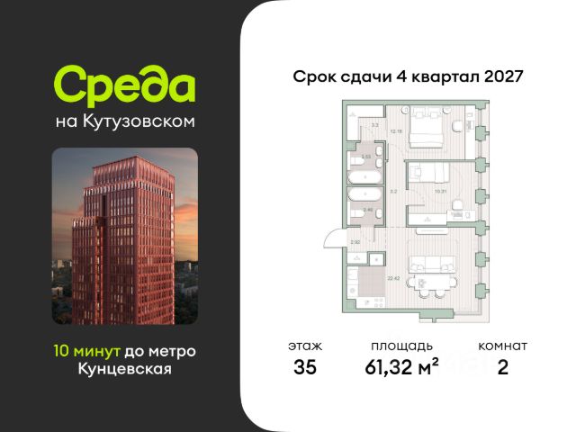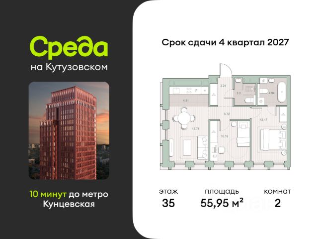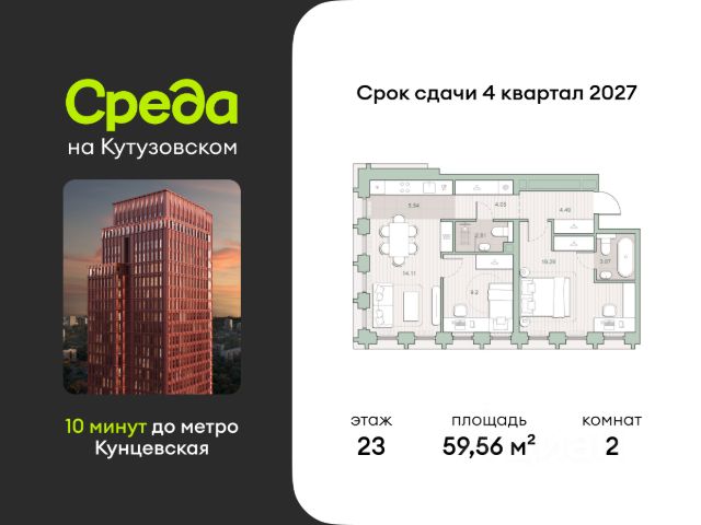 О квартире Продаётся двухкомнатная квартира общей площадью 57.69 кв. м. с отделкой на выбор: черновая, White Box. Квартира на 9 этаже корпуса 4.2 в жилом комплексе бизнес-класса "Среда на Кутузовском". До метро "Кунцевская" 10 минут пешком. Исторический зелёный район "Среда на Кутузовском" строится в Кунцево - историческом и экологически чистом районе Москвы. Здесь нет крупных производств, много лесных массивов и роза ветров, которая обеспечивает приток чистого воздуха. Район наполнен жизнью и уже развит: много детских садов и школ, поликлиники, магазины, кафе, спортивные объекты, парки. - 10 минут пешком до станции метро "Кунцевская". - 5-8 минут на машине до Кутузовского проспекта и Можайского шоссе и 10-15 минут до Рублёвского и МКАД. - 15 минут езды до Крылатских холмов, Суворовского парка и заказника "Долина реки Сетунь". Акции и спецпредложения - Выгода 12%: если внести 100% оплату или оформить семейную ипотеку под 6%. Действует до 13 апреля. - Низкие ставки по ипотеке: 0,1% в первый год или 0,11% в первые два года кредита. - Трейд-ин от "Среды": можно обменять свою текущую квартиру на новую. - Ипотека для семей с детьми: если ребёнку до 7 лет, предлагаем льготную ставку 3,5% О жилом комплексе "Среда на Кутузовском" - новый квартал с башнями от 12 до 44 этажей, окружённый лесными массивами и историческими усадьбами старой Москвы. Во внутреннем дворе есть водоём, многоуровневые зоны с детскими и спортивными площадками, коворкинг на свежем воздухе и локации для уединённого отдыха. Особенности - Архитектура с многослойными фасадами. - Квартиры с террасами и мастер-спальнями. - Окна в пол на всех этажах. - Общественные лаунж-гостиные. - Собственный ландшафтный парк во дворе. - Зоны барбекю и площадки для отдыха у воды. - Умный подземный паркинг. - Стрит-ритейл на первых этажах.