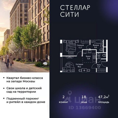 Продается квартира от надежного застройщика Tashir Estate в квартале бизнес-класса Stellar City в ЗАО Москвы. Площадь квартиры составляет: 46.7 кв. м, потолки: 3.1 м Квартира находится на 12 этаже, 4 корпуса жилого квартала Stellar City — микрогорода будущего на орбите Москвы. Stellar City — квартал в ЗАО Москвы вблизи инновационного центра Сколково. В окружении — 11 парков и природных зон, в том числе Долина реки Сетунь, Мещерский лес и парк развлечений The Rink. Город в городе Чтобы дом и инфраструктура вокруг отвечала динамичному лайфстайлу жителя мегаполиса, в основу проекта легла концепция город в городе, которая позволяет решать все бытовые вопросы in-home. В квартале будут возведены школа и детский сад, воркаут-зоны, променад, вело и беговые дорожки, детские площадки для каждого корпуса, а также коммерция на первых этажах для ежедневных покупок. Все необходимое — на расстоянии нескольких шагов. Изящные и лаконичные лобби Авторский дизайн, натуральные материалы в отделке и безупречный интерьер вне времени. Лобби и холлы в проекте бизнес-класса Stellar City ничем не отличаются от входных групп в премиум-сегменте благодаря качественным европейским материалам в отделке, стильному дизайну, консьерж-сервису и уютной зоне ожидания с журнальными столиками и мягкой мебелью. Комфорт и безопасность Закрытая территория, охрана, система СКУД, специально разработанное мобильное приложение дома для резидентов и подземный паркинг с круглосуточным наблюдением и доступом с помощью автоматического считывания номера авто.