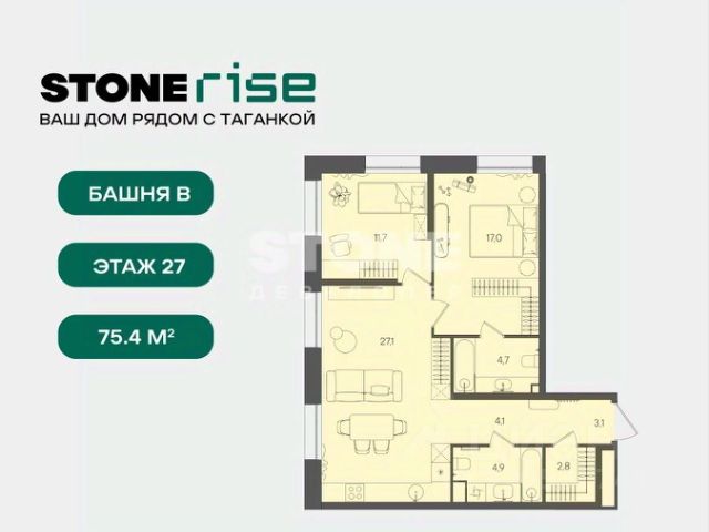 Старт продаж квартир в ЖК бизнес+ класса от девелопера STONE В продаже функциональная и светлая двуспальная квартира с кухней-гостиной, балконом и двумя спальнями для реализации любого дизайн-решения, идеально подходящая молодым парам, которые только планируют пополнение, а также небольшим семьям, где малыш уже подрастает. Квартира расположена в камерном низкоэтажном жилом комплексе бизнес+ в одной станции от кольца. СТОУН Райз находится в уникальной точке с быстрым доступом ко всем ключевым локациям Москвы. Жилой комплекс располагается на границе Таганского района в одной станции от Кольцевой линии метро и в 8 минутах от Садового кольца. Близость к ЦАО обеспечивает выезды на основные магистрали. В 3 минутах от комплекса располагается новый ТПУ Серп Молот, которые объединяет 2 линии метро и МЦД. - 3 мин. м. "Римская", "Площадь Ильича" - 3 мин ТПУ "Серп и Молот", МЦД-2, МЦД-4 - 2 станции на метро до ГЭС-2 и Третьяковки, до Чистых прудов и Сретенского бульвара по салатовой - 10 минут пешком до набережной Яузы и 20 минут до трех разных парков Архитектура Архитектурный проект разработан московским бюро WALL, известным работой над премиальными жилыми и офисными зданиями. Фасады домов выполнены из бетонной плитки серого и лого м изумрудного оттенков, а также металлических кассет. Вход в комплекс осуществляется через единое гранд-лобби. Здесь будут расположены кофейня, почты с локерами, а также комфортная гостиная с мягкой мебелью. В каждом корпусе расположены лаунж-зоны с естественным освещением в зоне лифтов. Благоустройство Территория комплекса полностью закрыта для машин и случайных посетителей. В центре - прогулочная аллея с дизайнерским освещением и местами для отдыха. В комплексе также обустроена площадка для выгула собак. Маршруты движения внутри двора продуманы для удобства пеших прогулок. Инфраструктура жилого комплекса На первых этажах комплекса расположены кафе, магазины, фитнес-студия и другие сервисные объекты. Двухуровневый подземный паркинг с возможностью выбора стандартных, увеличенных или семейных мест. Для удобства жителей предусмотрены лапомойки, келлеры, места для временного хранения велосипедов и самокатов. В СТОУН Райз также спроектировано многоуровневое пространство для жителей: - Бизнес-гостиная и детская-игровая, многофункциональное цифровое пространство - Благоустроенная общественная терраса с панорамными видами STONE - девелопер коммерческой и жилой недвижимости классов бизнес и премиум в Москве с 19-летним опытом. С 2022 года занимает лидирующую позицию на офисном рынке (рейтинг РБК). Сегодня в портфеле девелопера представлено 3 млн кв. м построенных, строящихся и проектируемых объектов, из которых более 1 млн кв. м находятся в стадии строительства. Компания имеет самый масштабный проектный портфель офисной недвижимости класса А на московском рынке (данные NF Group) и возглавляет топ-6 устойчивых девелоперов согласно исследованию F Research от Forbes. В 2023 году частью стратегии по развитию компании стала диве