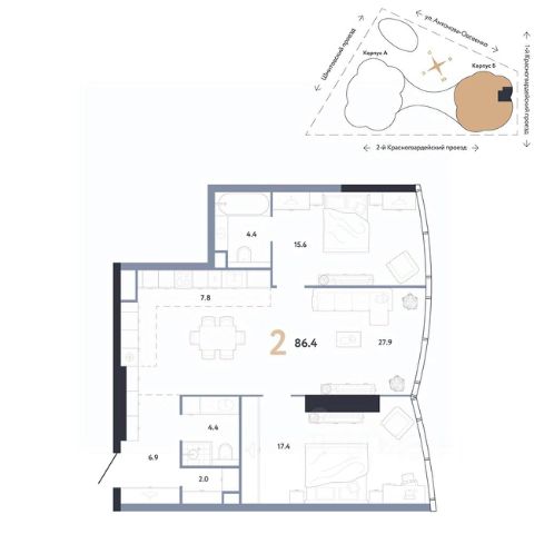 • ✓ Самая большая площадь: 86,4 м²