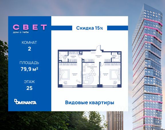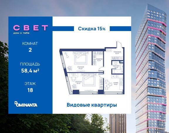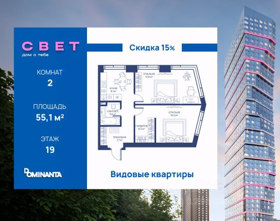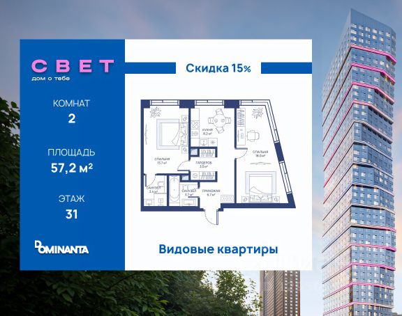 Продаётся 2-к квартира 56.8 кв.м. на 3-м этаже 51 этажного дома. Без отделки. Срок сдачи: 1 кв. 2028 г. Жилой комплекс "СВЕТ" — воплощение современного комфорта и архитектурного изящества, созданное девелопером Dominanta в сотрудничестве с известным бюро СПИЧ. Комплекс представляет собой элегантное 52-этажное здание, расположенное в Западном Дегунино, на Дмитровском шоссе, 83А. Удачное местоположение обеспечивает удобство для жителей: станция метро "Селигерская" находится в пешей доступности, что делает путь в центр Москвы быстрым и комфортным. Транспортная доступность: - 5 минут пешком до станции метро "Селигерская" - 15 минут на машине до ТТК - 16 минут на транспорте до станции МЦД "Моссельмаш" Квартиры бизнес-класса в ЖК "СВЕТ" сочетают функциональность и эстетическое совершенство. Панорамные окна наполняют жилые пространства естественным светом и открывают захватывающие виды на мегаполис. Каждый житель дома получит доступ к бесплатной клубной инфраструктер SocialHUB. Для бизнес-задач и запуска личных проектов хоум-офис c рабочими станциями, переговорными и креативной студией. Для отдыха и формирования новых социальных связей ивент-пространство, которое подойдет для вечеринки, кинопоказа или паблик-тока. Для новых побед зоны для занятия киберспортом. И главное SocialHUB полностью бесплатен для жителей, все расходы на его содержание покрываются застройщиком. Территория проекта "СВЕТ" включает несколько сценарных зон: ландшафтный парк с шаговой тропой, спортивная зона, открытый амфитеатр, двухуровневая детская площадка, уличные рабочие станции и беседки для отдыха. Сложный рельеф с искусственными холмами и живыми изгородям позволяет эффективно разделить пространство на активные зоны и уединённые "кабинеты" для работы, отдыха или медитации. В ЖК "СВЕТ" каждый найдет арену для своей энергии. Для любителей динамичных игр — павильон для падел (модного микса тенниса и сквоша). Рядом — площадка для стритбола и столы для пинг-понга, где можно устроить соседский турнир! И, конечно, абсолютный мастхэв — зона воркаут для функциональных тренировок под открытым небом. У входа в жилой комплекс гостей встречается арт-объект, разработанный Студией Артемия Лебедева. Его мягкий, волнообразный силуэт напоминает разлитый свет. С заходом солнца арт-объект оживает благодаря светоотражающим материалам его форма становится динамичной и задает настроение всему пространству.