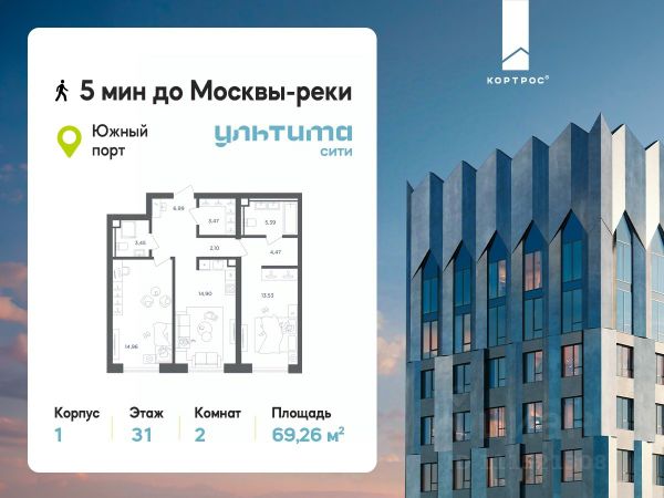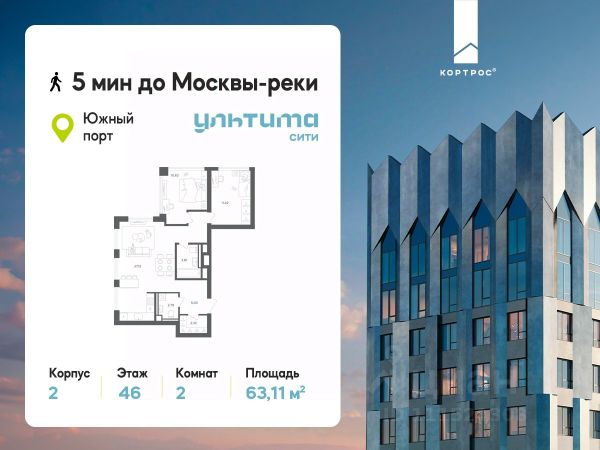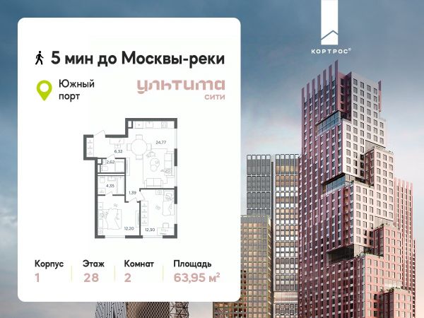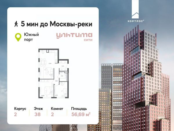 Предложение месяца от застройщика: - Скидка до 10% на ограниченный пул квартир - Рассрочка 0% на 1,5 год - Рассрочка 0% с первоначальным взносом от 10% - Ипотека для всех, ставка 7% на 7 лет - Семейная ипотека без удорожания, ставка 4% - Ипотека для всех на весь срок, ставка 11,89% Продаётся 2-комнатная квартира от застройщика ГК "КОРТРОС" в жилом комплексе бизнес-класса УЛЬТИМА Сити. Квартира расположена на 7 этаже 52 этажного корпуса 2. Общая площадь 54,85 м². Без отделки. УЛЬТИМА Сити — жилой комплекс бизнес-класса в перспективном районе на юго-востоке Москвы. На его территории появятся 9 башен на 756 этажей, двухуровневый подземный паркинг, собственная инфраструктура, включая детский сад и школу. Всего девелопер благоустроит территорию в 2,6 га. Ближайшая станция метро — "Южный порт". Она откроется в 2028 году и будет находиться в 2-х минутах ходьбы. А прямо напротив расположится остановка водного автобуса-электрохода "Синичка". Дорога от квартала будет удобна и для автомобилистов: - до Кремля — 12 км - до МКАД — 12 км - до выезда на ТТК — 3 км - до Садового кольца — 8 км В двух корпусах первой очереди УЛЬТИМА Сити этажностью 45 и 52 реализуется 1 079 квартир с продуманными, рациональными планировочными решениями. В ассортиментной линейке представлены однокомнатные квартиры от 28,2 до 61 кв. м, двухкомнатные лоты от 44,3 до 95,4 кв. м, квартиры с тремя (71 — 115,57 кв. м) и четырьмя спальнями (106,6 — 114,97 кв. м). В экспозиции также есть квартиры с террасами, лоджиями, тремя и четырьмя санузлами, а также с функциональными нишами-кладовыми на кухнях. Запроектированы и эксклюзивные двухуровневые резиденции со вторым светом, в том числе с видом на Москву-реку, площадью от 77,7 до 141,9 кв. м. В рамках проекта запланировано строительство 9 корпусов, школы на 500 учащихся и детского сада на 225 мест. Еще будет создана продуманная инфраструктура для жителей: детские и спортивные площадки, амфитеатр для мероприятий, беседки и теплицы для садоводства, коворкинг, детский клуб и ресторан с открытой террасой. Доступ в жилой комплекс осуществляется по биометрическому контролю. Вокруг квартала будет приватная территория с видеонаблюдением и консьерж-сервисом 24/7. Лобби корпусов будут иметь двойные выходы: на улицу и во внутренний закрытый двор.