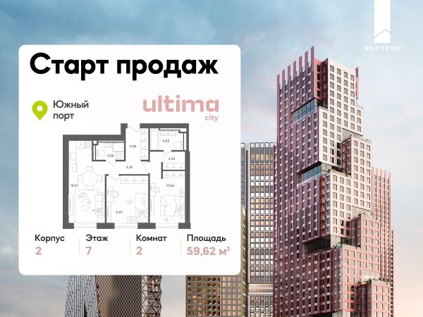 Указанная акционная стоимость доступна при 100% оплате или ипотеке без субсидирования. Цена действует до 31.12.2025 23:49:59. Стоимость без акции 22653050. Старт продаж! Продаётся 2-комнатная квартира от застройщика ГК "КОРТРОС" в жилом комплексе бизнес-класса ULTIMAcity. Квартира расположена на 3 этаже 52 этажного корпуса 2. Общая площадь 54,85 м². Без отделки. В квартире: • Мастер-спальня • Гардеробная • Ниша-кладовая на кухне • Два сан. узла ULTIMAcity — жилой комплекс бизнес-класса в перспективном районе на юго-востоке Москвы. На его территории появятся 9 башен на 756 этажей, двухуровневый подземный паркинг, собственная инфраструктура, включая детский сад и школу. Всего девелопер благоустроит территорию в 2,6 га. Ближайшая станция метро — "Южный порт". Она откроется в 2028 году и будет находиться в 2-х минутах ходьбы. А прямо напротив расположится остановка водного автобуса-электрохода "Синичка". Дорога от квартала будет удобна и для автомобилистов: - до Кремля — 12 км - до МКАД — 12 км - до выезда на ТТК — 3 км - до Садового кольца — 8 км В двух корпусах первой очереди ULTIMAcity этажностью 45 и 52 реализуется 1 079 квартир с продуманными, рациональными планировочными решениями. В ассортиментной линейке представлены однокомнатные квартиры от 28,2 до 61 кв. м, двухкомнатные лоты от 44,3 до 95,4 кв. м, квартиры с тремя (71 — 115,57 кв. м) и четырьмя спальнями (106,6 — 114,97 кв. м). В экспозиции также есть квартиры с террасами, лоджиями, тремя и четырьмя санузлами, а также с функциональными нишами-кладовыми на кухнях. Запроектированы и эксклюзивные двухуровневые резиденции со вторым светом, в том числе с видом на Москву-реку, площадью от 77,7 до 141,9 кв. м. В рамках проекта запланировано строительство 9 корпусов, школы на 500 учащихся и детского сада на 225 мест. Еще будет создана продуманная инфраструктура для жителей: детские и спортивные площадки, амфитеатр для мероприятий, беседки и теплицы для садоводства, коворкинг, детский клуб и ресторан с открытой террасой. Доступ в жилой комплекс осуществляется по биометрическому контролю - Face ID. Вокруг квартала будет приватная территория с видеонаблюдением и консьерж-сервисом 24/7. Лобби корпусов будут иметь двойные выходы: на улицу и во внутренний закрытый двор.