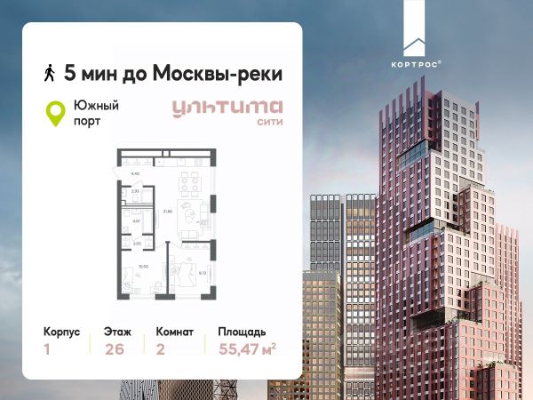 Предложение месяца от застройщика: - Скидка до 10% на ограниченный пул квартир - Рассрочка 0% на 1 год - Семейная ипотека без удорожания, ставка 4% - Ипотека для всех на весь срок, ставка 11,89% Продаётся 2-комнатная квартира от застройщика ГК "КОРТРОС" в жилом комплексе бизнес-класса УЛЬТИМА Сити. Квартира расположена на 7 этаже 52 этажного корпуса 2. Общая площадь 54,85 м². Без отделки. УЛЬТИМА Сити — жилой комплекс бизнес-класса в перспективном районе на юго-востоке Москвы. На его территории появятся 9 башен на 756 этажей, двухуровневый подземный паркинг, собственная инфраструктура, включая детский сад и школу. Всего девелопер благоустроит территорию в 2,6 га. Ближайшая станция метро — "Южный порт". Она откроется в 2028 году и будет находиться в 2-х минутах ходьбы. А прямо напротив расположится остановка водного автобуса-электрохода "Синичка". Дорога от квартала будет удобна и для автомобилистов: - до Кремля — 12 км - до МКАД — 12 км - до выезда на ТТК — 3 км - до Садового кольца — 8 км В двух корпусах первой очереди УЛЬТИМА Сити этажностью 45 и 52 реализуется 1 079 квартир с продуманными, рациональными планировочными решениями. В ассортиментной линейке представлены однокомнатные квартиры от 28,2 до 61 кв. м, двухкомнатные лоты от 44,3 до 95,4 кв. м, квартиры с тремя (71 — 115,57 кв. м) и четырьмя спальнями (106,6 — 114,97 кв. м). В экспозиции также есть квартиры с террасами, лоджиями, тремя и четырьмя санузлами, а также с функциональными нишами-кладовыми на кухнях. Запроектированы и эксклюзивные двухуровневые резиденции со вторым светом, в том числе с видом на Москву-реку, площадью от 77,7 до 141,9 кв. м. В рамках проекта запланировано строительство 9 корпусов, школы на 500 учащихся и детского сада на 225 мест. Еще будет создана продуманная инфраструктура для жителей: детские и спортивные площадки, амфитеатр для мероприятий, беседки и теплицы для садоводства, коворкинг, детский клуб и ресторан с открытой террасой. Доступ в жилой комплекс осуществляется по биометрическому контролю. Вокруг квартала будет приватная территория с видеонаблюдением и консьерж-сервисом 24/7. Лобби корпусов будут иметь двойные выходы: на улицу и во внутренний закрытый двор.