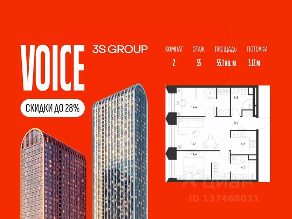 Ипотека от 3,5% на весь срок. Дополнительная скидка в офисе продаж! Продается уютная 2-комн. квартира площадью 53,9 кв.м на 5 этаже жилого комплекса бизнес-класса Voice Towers от 3S Group. Общая площадь: 53,9 кв.м., жилая: 34,9 кв.м., площадь кухни-гостиной: 17,8 кв.м., высокие потолки: 3,12 м., санузел совмещенный. О проекте: Voice. Высокие стандарты жизни Мы уверены, что высокие идеалы неизменно помогают достигать высот. Создавая Voice, мы ориентировались на людей с высокими требованиями к качеству и безупречным вкусом. Башни жилого комплекса, сочетают элегантную форму с динамичной геометрией фасадов, устремляются ввысь и отвечают самым высоким стандартам строительства. Технологичность, воплощенная в архитектуре - это ваш, собственный Voice. Преимущества локации Близость к метро Текстильщики, БКЛ и МЦК Новохохловская (10 мин) Рядом природный заповедник и конно-спортивная база Кузьминки-Люблино Будущее окружение Проект Южный порт - Текстильщики с деловым центром Сити-2 Небоскребы высотой до 300м Культурный центр с амфитеатром Променад вдоль Москвы-реки и яхт-клуб Архитектура Проект от Архитектурной мастерской Алексея Ильина Две перпендикулярные башни с арочными вершинами Высокая башня: светло-серый металл Низкая башня: терракотовая керамика Благоустройство Внешняя зона: парковки, магазины, кафе Внутренний двор: закрытая территория с озеленением Шумозащитный экран Сезонное озеленение Встречи на высоте Гранд-лобби высотой 8м Дизайнерская мебель Умные скоростные лифты Услуги Детский центр с игровой зоной Фитнес-студия для жителей
