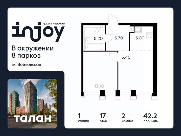 Прямая продажа от застройщика. В жилом квартале, расположенном в Войковском районе Москвы, продаётся 2-комнатная квартира площадью 61.7 кв.м без отделки. Квартира расположена на 2 этаже 35-этажного дома, корпус 1, в жилом квартале бизнес-класса INJOY. INJOY отделен от Ленинградского шоссе исторической застройкой и расположен всего в одном километре от магистрали: это возможность быстро добраться до центра или в любой район города по МКАДу или ТТК. Для автомобилей в INJOY — удобный подземный паркинг с доступом на лифте. Здесь же расположены кладовые площадью от 2,1 до 9 кв. м. Усилители сотового сигнала в лифтах и паркинге позволяют вести важные разговоры, не прерываясь на полуслове. Десятки мест отдыха вокруг INJOY дарят детям и взрослым запоминающиеся развлечения в любую погоду: от прогулок по паркам и природным зонам до интересного досуга в кругу семьи или друзей. 10 минут до парка Покровское-Стрешнево 12 минут до усадьбы Михалково 15 минут до Химкинского водохранилища 7 минут до ТРЦ "Метрополис" INJOY расположен в развитом сформировавшемся районе, что обеспечивает жителям обширную инфраструктуру в пешей доступности. МЦК "Балтийская" - 200 м Ленинградское шоссе - 1 км м. Войковская - 1 км ТТК - 7 км В проекте INJOY три очереди, разновидность которых формирует силуэт живого мегаполиса. Архитекторы международного бюро AI Studio придали индивидуальность каждому корпусу, чтобы все уголки INJOY обрели особенный характер. Планировки и форматы квартир уникальны: пентхаусы, квартиры с террасами, мастер-спальнями, выходом на променад, угловым остеклением, лоджиями, гардеробными, кладовыми и постирочными. Внутренний двор INJOY продолжает общую концепцию благоустройства и включает в себя: три детские площадки для разных возрастов, зону work-out, природную озеленённую зону, променад с зонами для релакса, йоги и амфитеатром с арт-объектами. Закрытый двор, видеонаблюдение и контроль доступа обеспечивают безопасность каждому жителю комплекса. Стоимость квартиры - 26986400 Р. Срок сдачи - 1 квартал 2027. Более подробную информацию по объекту уточняйте по телефону и в отделе продаж.