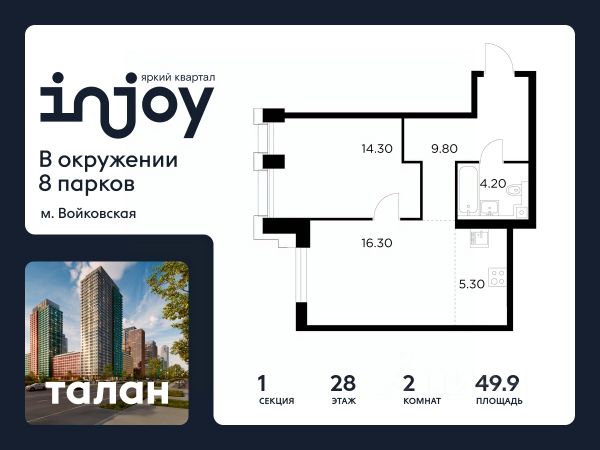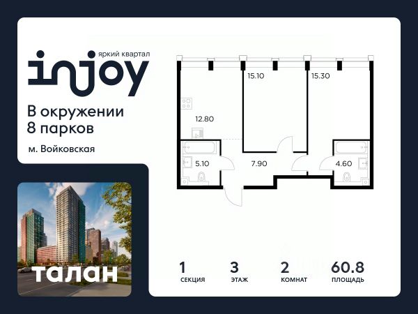 Прямая продажа от застройщика. В жилом квартале, расположенном в Войковском районе Москвы, продаётся 2-комнатная квартира площадью 61.7 кв.м без отделки. Квартира расположена на 2 этаже 35-этажного дома, корпус 1, в жилом квартале бизнес-класса INJOY. INJOY отделен от Ленинградского шоссе исторической застройкой и расположен всего в одном километре от магистрали: это возможность быстро добраться до центра или в любой район города по МКАДу или ТТК. Для автомобилей в INJOY — удобный подземный паркинг с доступом на лифте. Здесь же расположены кладовые площадью от 2,1 до 9 кв. м. Усилители сотового сигнала в лифтах и паркинге позволяют вести важные разговоры, не прерываясь на полуслове. Десятки мест отдыха вокруг INJOY дарят детям и взрослым запоминающиеся развлечения в любую погоду: от прогулок по паркам и природным зонам до интересного досуга в кругу семьи или друзей. 10 минут до парка Покровское-Стрешнево 12 минут до усадьбы Михалково 15 минут до Химкинского водохранилища 7 минут до ТРЦ "Метрополис" INJOY расположен в развитом сформировавшемся районе, что обеспечивает жителям обширную инфраструктуру в пешей доступности. МЦК "Балтийская" - 200 м Ленинградское шоссе - 1 км м. Войковская - 1 км ТТК - 7 км В проекте INJOY три очереди, разновидность которых формирует силуэт живого мегаполиса. Архитекторы международного бюро AI Studio придали индивидуальность каждому корпусу, чтобы все уголки INJOY обрели особенный характер. Планировки и форматы квартир уникальны: пентхаусы, квартиры с террасами, мастер-спальнями, выходом на променад, угловым остеклением, лоджиями, гардеробными, кладовыми и постирочными. Внутренний двор INJOY продолжает общую концепцию благоустройства и включает в себя: три детские площадки для разных возрастов, зону work-out, природную озеленённую зону, променад с зонами для релакса, йоги и амфитеатром с арт-объектами. Закрытый двор, видеонаблюдение и контроль доступа обеспечивают безопасность каждому жителю комплекса. Стоимость квартиры - 26986400 Р. Срок сдачи - 1 квартал 2027. Более подробную информацию по объекту уточняйте по телефону и в отделе продаж.
