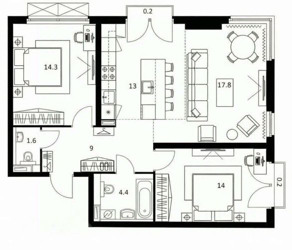 Отдельная гардеробная + дополнительные системы хранения в коридоре и ванной.