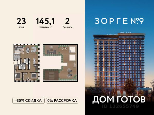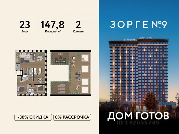 "Зорге 9" — готовые апартаменты бизнес-класса на Ходынке. 10 минут до Москва-Сити. Архитектура: 3 современных корпуса с фасадами в стиле архитектуры Нью-Йорка и с сервисами премиальных отелей, высотой до 23 этажа. Строгие линии, панорамные окна создают ощущение неподдельной роскоши и комфортной жизни в сердце мегаполиса. Проект награжден авторитетной премией European Property Awards. Резиденции: Свободная планировка, небольшая глубина этажа, огромные панорамные окна в пол до 3,6 м и высота потолков до от 3,3 до 4,3 м позволяют реализовать самые смелые концептуальные идеи и создать идеальный интерьер с учетом всех пожеланий. Вдохновляющие виды на город украсят ваш апартамент лучше любой картины. Есть возможность приобретения дизайн-проекта и полной меблировки апартаментов от партнеров девелопера. Расположение: 3 мин. пешком до парка Березовая роща 10 мин. пешком до Ходынского поля 10 мин. до ТЦ Авиапарк 30 минут до Шереметьево 10 мин до Москва-Сити или 1 станция до Москва-Сити 5 минут до ТТК 4 станции метро в шаговой доступности: 6 мин м. Полежаевская (фиолетовая ветка) 7 мин МЦК Зорге (МЦК) 7 мин м. Хорошевская (голубая ветка) 10 мин МЦК Хорошёво (МЦК) Благоустройство: Собственный парк 2 га с амфитеатром и поющими фонтанами. В парке высажено 136 деревьев и более 11 000 кустов и мелких растений из немецких питомников. Площадка для йоги и воркаут-зона со спортивными площадками. Теннисные столы и детский плейхаб Две башни Авторское гранд-лобби В лобби предусмотрена лаундж-зона, чайная с камином, комната для хранения велосипедов и колясок. Доступ по системе FACE ID. В отделке лобби и лифтовых холлов использован декоративный камень итальянского бренда Atlas Concorde Пентхаусы На верхнем уровне комплекса расположены роскошные просторные пентхаусы с высотой потолка до 4,2 метра и панорамными окнами до 3,6 метров, открывающими великолепные виды на столицу. Пентхаусы с выходами на собственные приватные террасы на кровле, площадью от 150 кв. м являются жильем high-уровня, демонстрирующим высокий статус владельца. 2-комнатная квартира 2-комнатных квартир в Зорге 9 в Москве.