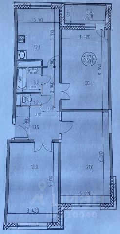Прихожия-4,0, коридор-9,1, туалет- 1,7, жилая комната с кладовой -20,8, жилая комната -11,0, комната -студия -18,9, ванная - 3,9, 2 лоджии- по 4,0.
