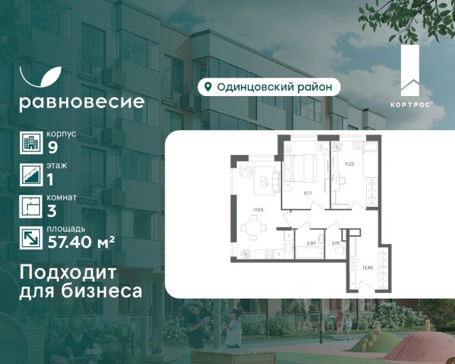 Апартаменты на первом этаже, где можно не только жить, но и развивать своё дело. Подойдёт для мини-кофейни, коворкинга или кабинета частной практики. Современная отделка и комфортная планировка создают атмосферу для вдохновения. Указанная акционная стоимость доступна при 100% оплате или ипотеке без субсидирования. Цена действует до 31.12.2026 23:59:00. Стоимость без акции 12757500. Продаётся апартамент с 3 комнатами общей площадью 56.70 кв. метров на 1 этаже жилого квартала комфорт-класса "Равновесие". На территории комплекса будет возведен детский сад на 360 мест, а на первых этажах жилых домов откроются кафе, магазины и все необходимое для удобства жителей. Локация "Равновесия" выделяется среди других пригородных ЖК разнообразием быстрых маршрутов до Москвы. Для автомобилистов преимуществом станут удобные выезды на Можайское шоссе, Рублёво-Успенское шоссе, Минское шоссе с платной трассой и другие. Также в пешей доступности находятся две ж/д станции — "Жаворонки" и "Здравница". Дорога на электропоезде до делового центра "Москва-Сити" составит всего 35 минут. Особенности ЖК: - Малоэтажная застройка: 4-6 этажей; - Благоустроенный пешеходный бульвар; - Пространства для отдыха и спорта; - Квартиры с террасами на последних этажах; - Квартиры с отдельным входом на первых этажах; - Внутренняя территория квартала свободна от машин; - Безбарьерная среда; - Помещения для хранения детских колясок и спортивного инвентаря.