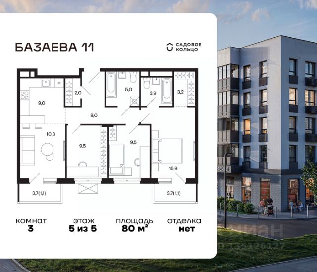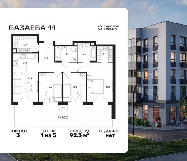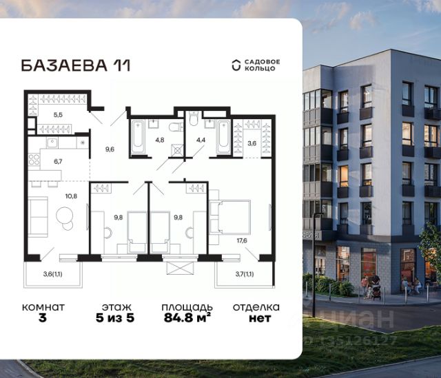 Продается квартира в ЖК "Базаева, 11" с 3 спальнями на 5 этаже 5 этажного дома. Общая площадь: 84.8 кв.м. Высота потолков 2.72 м. Срок сдачи 2 квартал 2027 г. Эскроу-счет. Застройщик ГК "Садовое кольцо". -Расположение Жилой комплекс в экологически чистом районе Московской области городском округе Шаховская. Камерное пятиэтажное здание находится в пешей доступности от всей необходимой инфраструктуры. Автостанция Шаховская расположена в 10 минутах от дома. Всего в 11 минутах ходьбы находится ж/д станция Шаховская, откуда удобно добраться электричкой до Рижского вокзала. Дорога до МКАД займет 1,5 часа на автомобиле. -Инфраструктура Проект расположен рядом с современным теннисным центром и Дворцом торжеств. В шаговой доступности — детская школа искусств, Шаховская гимназия, школа 1 и три детских сада. Всего за 3 минуты от дома можно дойти до Городского парка — здесь вас ждут аттракционы, верёвочный городок, тюбинговая горка и ресторан. Парк соседствует с живописным сквером у реки, украшенным подвесными мостами, ротондой и фонтанами. -Внутренний двор На территории проекта появится огороженная детская площадка, рассчитанная на детей всех возрастов, — с песочницей, канатным комплексом и зоной для игр. Для любителей активного образа жизни будет обустроена спортивная площадка с теннисным столом, турниками, тренажёрами и гимнастическими брусьями. Для автовладельцев на территории проекта предусмотрена удобная плоскостная парковка на 81 машино-место. -Архитектура Монохромное здание оформлено декоративным кирпичом и штукатуркой в тёплых светло-серых и насыщенных серых тонах. Эстетику фасада подчёркивают террасные ограждения и корзины для кондиционеров, выдержанные в единой цветовой гамме. -Входная группа Входные группы спроектированы на уровне земли — без ступеней и перепадов. Такой подход обеспечивает комфортный доступ в подъезд с коляской, чемоданом или велосипедом и подчеркивает продуманную архитектуру дома.