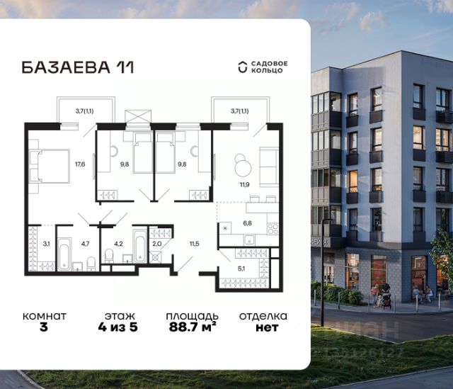 Продается квартира в ЖК "Базаева, 11" с 3 спальнями на 3 этаже 5 этажного дома. Общая площадь: 80 кв.м. Высота потолков 2.72 м. Срок сдачи 2 квартал 2027 г. Эскроу-счет. Застройщик ГК "Садовое кольцо". -Расположение Жилой комплекс в экологически чистом районе Московской области городском округе Шаховская. Камерное пятиэтажное здание находится в пешей доступности от всей необходимой инфраструктуры. Автостанция Шаховская расположена в 10 минутах от дома. Всего в 11 минутах ходьбы находится ж/д станция Шаховская, откуда удобно добраться электричкой до Рижского вокзала. Дорога до МКАД займет 1,5 часа на автомобиле. -Инфраструктура Проект расположен рядом с современным теннисным центром и Дворцом торжеств. В шаговой доступности — детская школа искусств, Шаховская гимназия, школа 1 и три детских сада. Всего за 3 минуты от дома можно дойти до Городского парка — здесь вас ждут аттракционы, верёвочный городок, тюбинговая горка и ресторан. Парк соседствует с живописным сквером у реки, украшенным подвесными мостами, ротондой и фонтанами. -Внутренний двор На территории проекта появится огороженная детская площадка, рассчитанная на детей всех возрастов, — с песочницей, канатным комплексом и зоной для игр. Для любителей активного образа жизни будет обустроена спортивная площадка с теннисным столом, турниками, тренажёрами и гимнастическими брусьями. Для автовладельцев на территории проекта предусмотрена удобная плоскостная парковка на 81 машино-место. -Архитектура Монохромное здание оформлено декоративным кирпичом и штукатуркой в тёплых светло-серых и насыщенных серых тонах. Эстетику фасада подчёркивают террасные ограждения и корзины для кондиционеров, выдержанные в единой цветовой гамме. -Входная группа Входные группы спроектированы на уровне земли — без ступеней и перепадов. Такой подход обеспечивает комфортный доступ в подъезд с коляской, чемоданом или велосипедом и подчеркивает продуманную архитектуру дома.