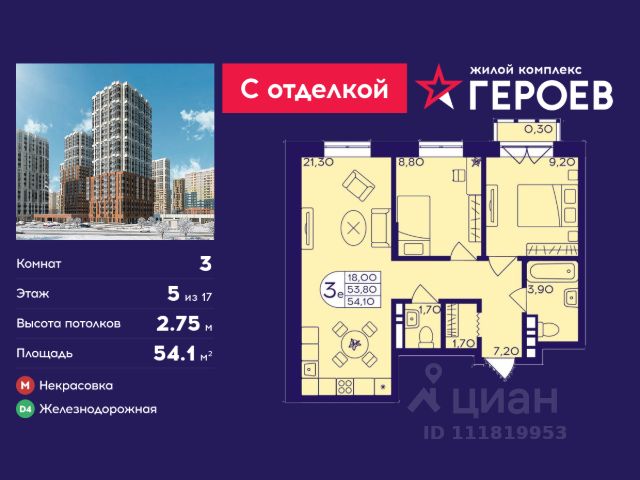 Продаётся 3-комнатная квартира 59.2 кв. м. в жилом комплексе "Героев" в Балашихе, Железнодорожный. Квартира расположена на 5 этаже 406 корпуса. Все квартиры представлены с чистовой отделкой. Вам не нужно тратить время и дополнительные финансы на ремонт или жить в шуме строительных работ - достаточно перевести свои вещи, расставить мебель и всё готово! Жилой квартал "Героев" - это уютный проект для семей с детьми. Всего 40 минут до центра Москвы. В квартале созданы все условия для досуга всех возрастов: игровые и спортивные площадки, места для отдыха и прогулок, магазины, кафе и пункты выдачи. За 15 минут можно дойти от дома до Ольгинского лесопарка - популярного места для прогулок и отдыха на свежем воздухе. Здесь приятно гулять всей семьёй, заниматься спортом или устроить пикник в выходной день. Преимущества: Квартира с готовой отделкой. Пространство полностью подготовлено для жизни: не нужно тратить время и деньги на ремонт или ждать его окончания. После получения ключей достаточно расставить мебель - и можно сразу заезжать и жить. Продуманные и светлые планировки. Просторные кухни-гостиные создают комфортное пространство для отдыха и встреч с близкими. В квартирах предусмотрены удобные гардеробные, благодаря чему легко поддерживать порядок и не перегружать комнаты шкафами. Увеличенное остекление. Большие окна наполняют квартиру естественным светом в течение всего дня, создавая ощущение простора и уюта, а также визуально расширяя пространство и делая интерьер более воздушным. Пешая доступность до станции Железнодорожная (МЦД-4) - дорога займёт не более 30 минут до центра Москвы: станции метро "Курская", "Площадь Ильича" или ТПУ Нижегородская.