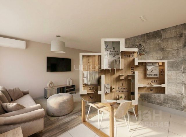В гостиной — круглый обеденный стол, большой диван, телевизор 65 дюймов со смарт-тв и Алисой.